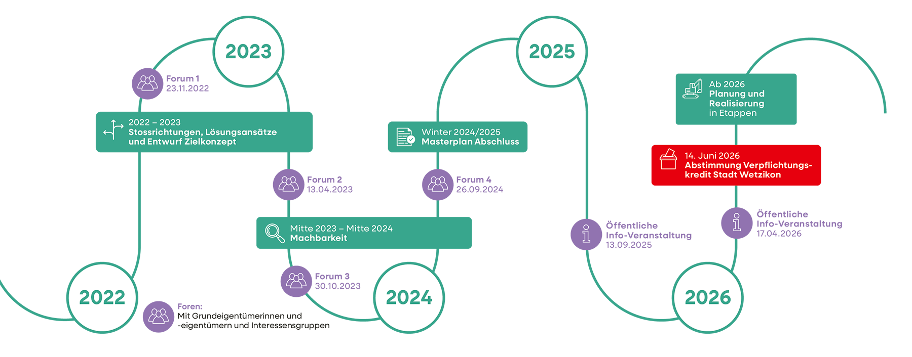 2020 beauftragte das Stadtparlament den Stadtrat von Wetzikon, einen Masterplan auszuarbeiten und einen entsprechenden Kredit für die Realisierung der öffentlichen Aufgaben der Stadt Wetzikon vorzuschlagen. Der entsprechende Verpflichtungskredit wird am 14. Juni 2026 den Stimmberechtigten an der Urne vorgelegt. Der Stadtrat und die SBB sind überzeugt, mit dem breit abgestützten Verfahren eine optimale Planung für das Generationenprojekt Stadtraum Bahnhof Wetzikon zu erhalten, die den Erwartungen und Bedürfnissen der Bevölkerung entspricht.